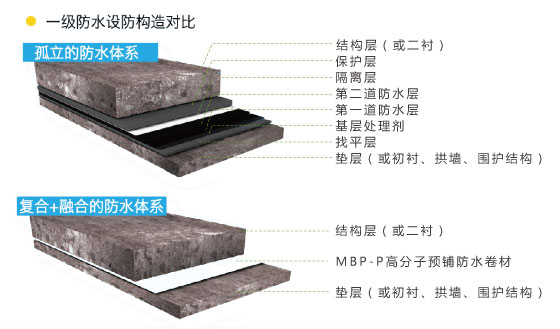 從上述對比可以看出傳統防水卷材建立的是孤立的防水體系,防水效果完全建立在防水層“天衣無縫”的基礎上,結構主體防水功能基本忽略不計,這是一種不切實際的幻想。反之,凱倫MBP-P高分子預鋪防水卷材能夠與混凝土結構主體共同建立復合+融合的防水體系,讓混凝土結構成為防水的主力軍。從此預鋪防水層的個別缺陷不會再導致整體防水體系的失效。從中我們也可以看出,防水層與混凝土結構的牢固融合是建立有效復合防水體系的前提,這正是凱倫公司該項產品對行業和社會的最大貢獻!