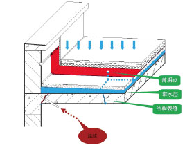 一般情況下,產(chǎn)生滲漏的三個條件分別是:防水層的“薄弱點”、防水層與主體混凝土結(jié)構(gòu)層之間存在“竄水層”、混凝土結(jié)構(gòu)板存在“結(jié)構(gòu)裂縫”,這種情況下,防水系統(tǒng)存在滲漏率高,防水維修困難的特點。在防水層無法做到“天衣無縫”、混凝土結(jié)構(gòu)也無法完全避免產(chǎn)生裂縫的情況下,要解決滲漏問題,消除“竄水層”是最為有效的方式。
